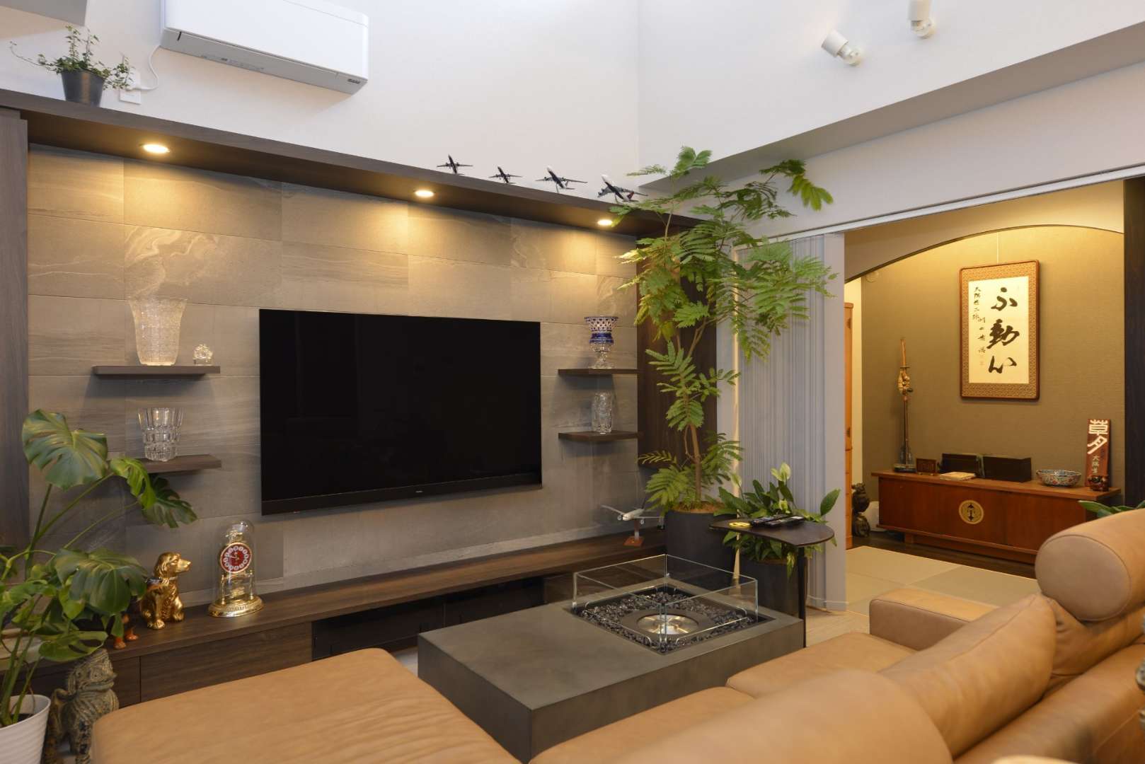 リビングテーブルには、リラックス効果が高いとされるバイオエタノール暖炉「EcoSmart Fire」を採用。安全に炎を取り入れることで、心安らぐ上質なライフスタイルを実現しました。