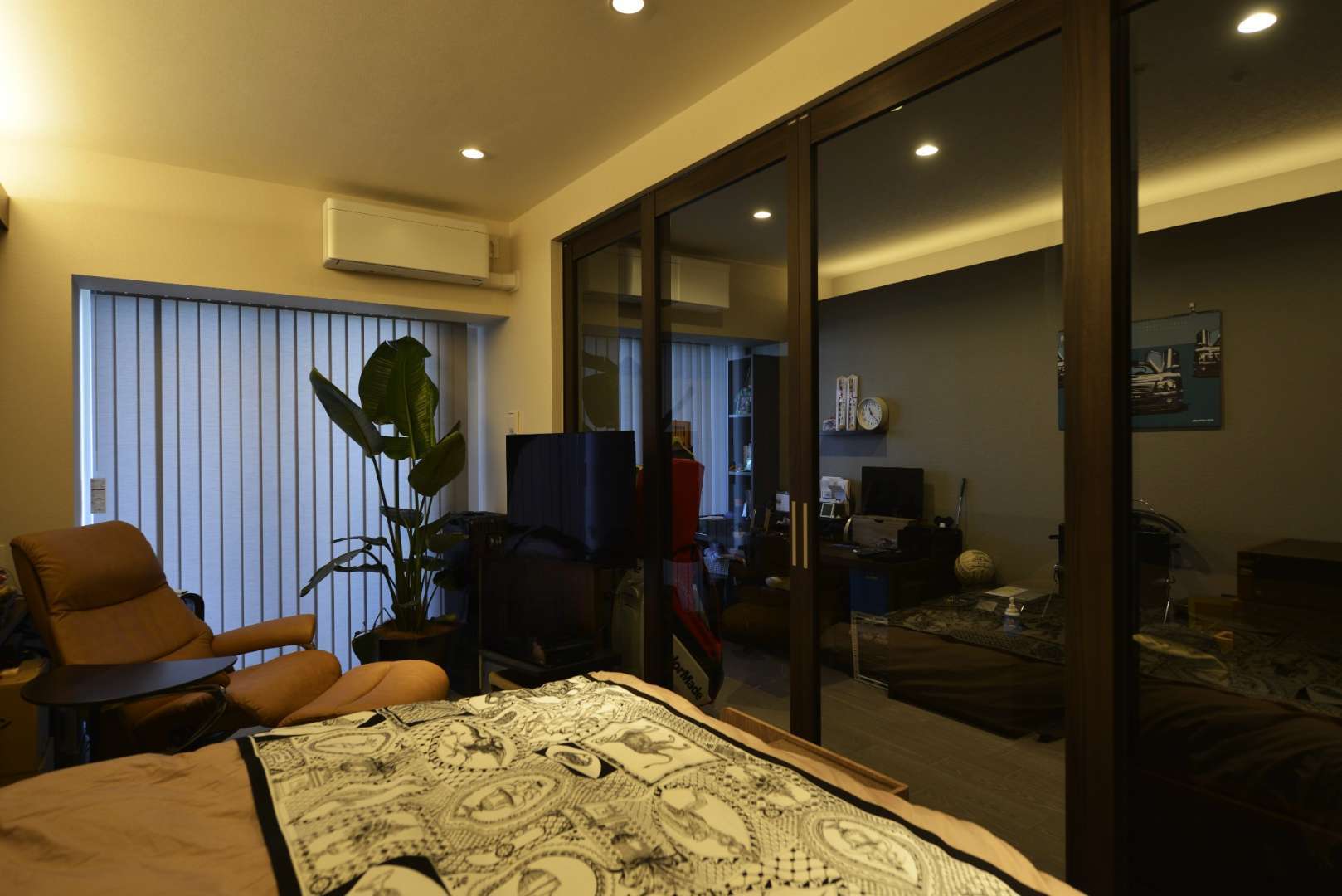 寝室と書斎の間仕切り壁をなくし、開放的な大空間にしました。仕切りにはガラス入りのハイドアを採用し、圧迫感を軽減しながらも、必要に応じてプライバシーを確保できる設計に。リラックスと機能性を兼ね備えた、快適な空間を実現しました。