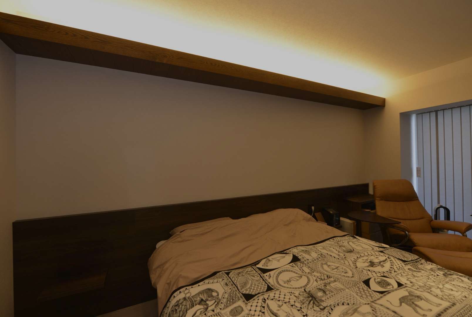 寝室は一日の疲れを癒し、リラックスできる空間となるよう工夫しました。枕元からの眺めには板張りの天井を造作し、柔らかな光が広がる調光機能付きの間接照明を配置。ヘッドボードやカウンターにはダーク系の木製家具を採用し、ベッドの両サイドにナイトテーブルを設置することで、ホテルライクな上質な空間を演出しました。