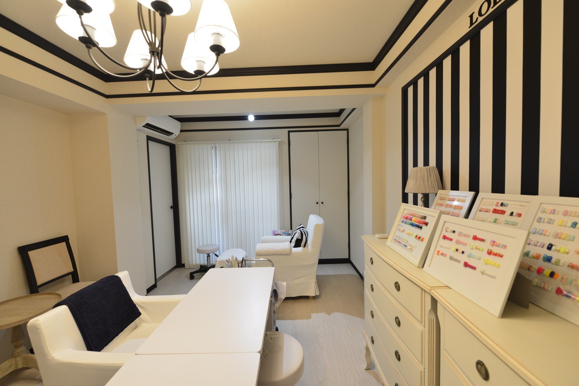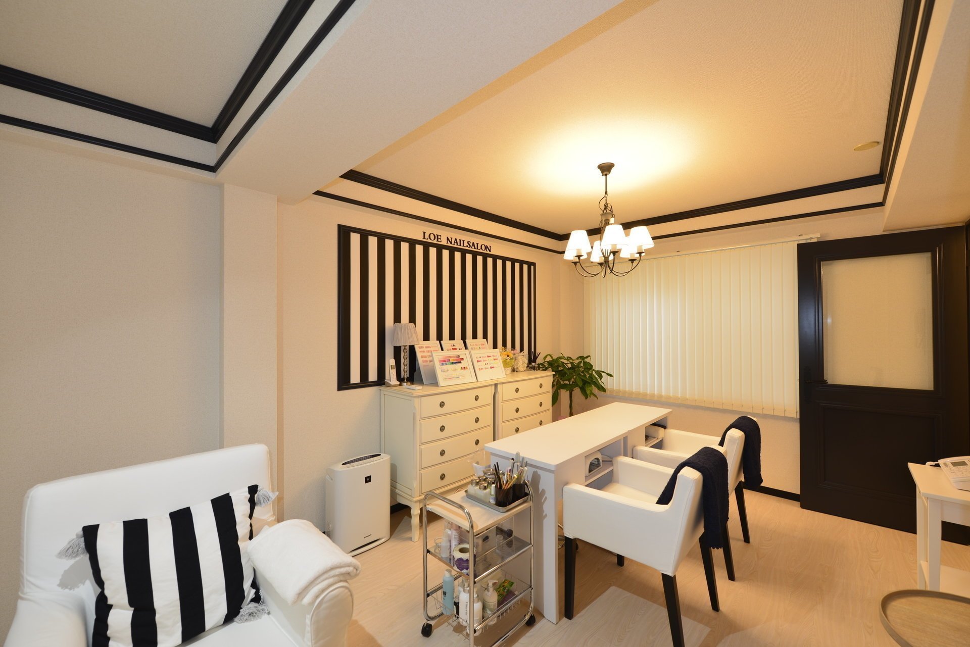 マンションの一室に入ると白い清潔感溢れる壁に、黒のラインアートが施されたモダンな空間が広がります。都内のネイルサロンで経験を積んだオーナーが独立し、柏にオープンした完全個室のネイルサロン。外観からは想像が出来ないような女性らしい空間がそこに広がっています。