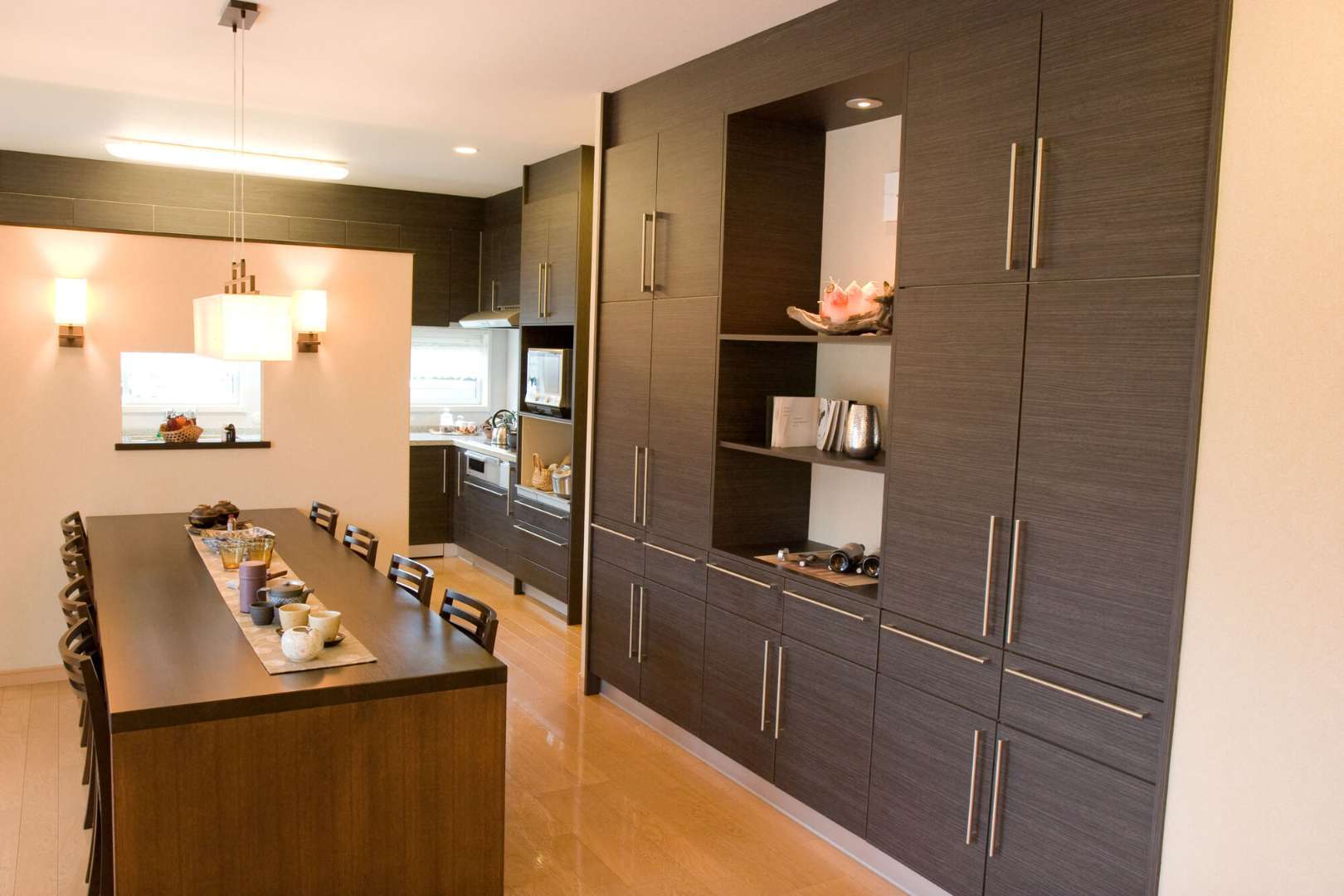 最近ニーズが高いのは、すっきりとしたキッチンまわり。アイランドキッチンなど壁付けでない場合は、キッチン上部に吊り戸棚をつけると視線の抜けを妨げ、窮屈な印象を与えてしまいます。また日常的に使いものを高い位置にしまっておくと出し入れが不自由ですし、重いものや大皿を収納するのも地震を考えるとためらわれます。