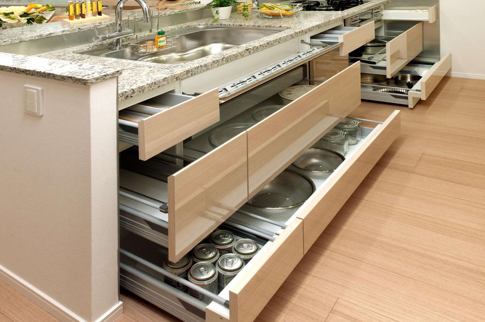 キッチンはご家庭ごとに、オープンなアイランド・キッチンや壁付けタイプ、半個室タイプなど、さまざまなケースがあることでしょう。したがって、キッチンに合わせた収納場所の増設が必要です。