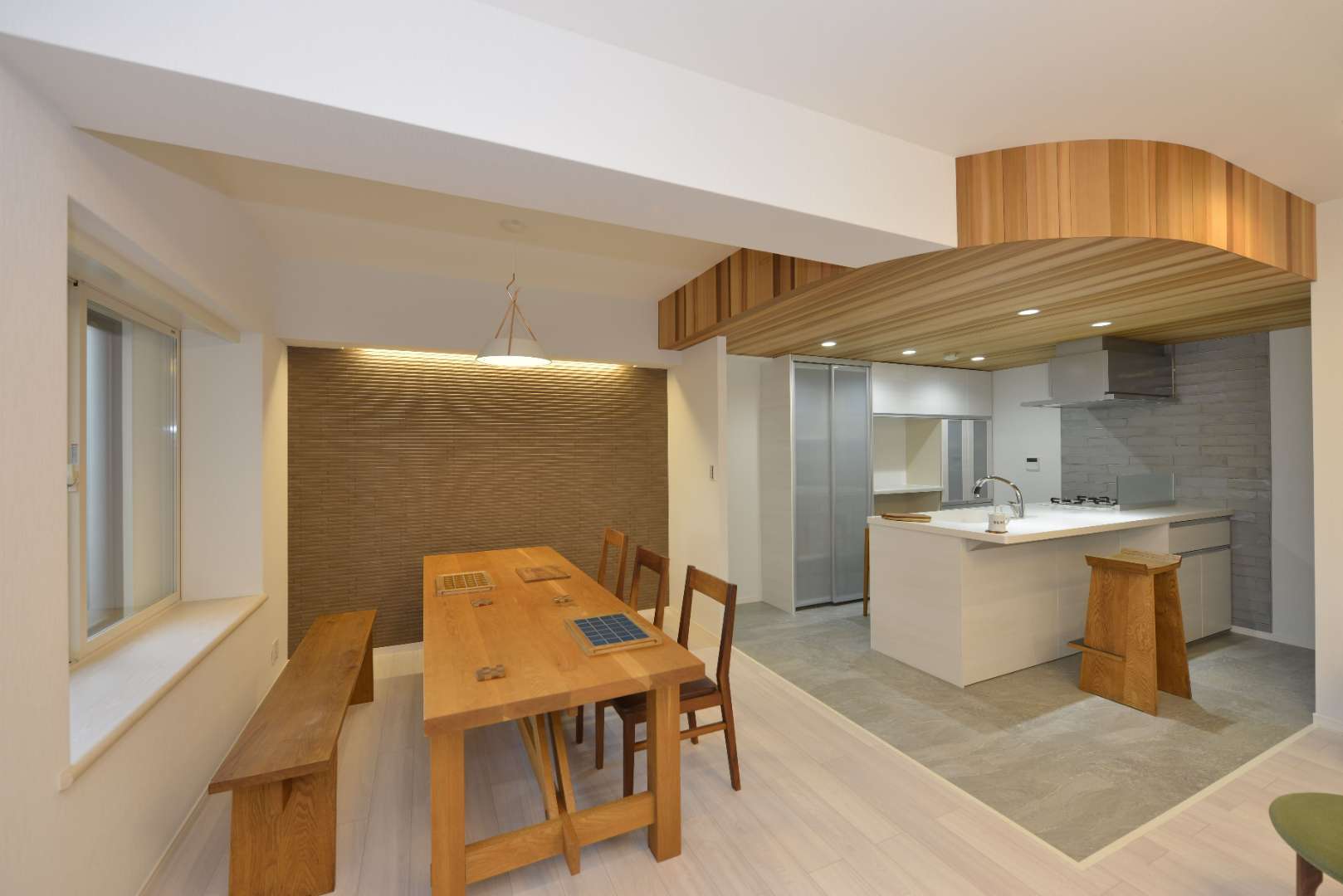 日中は窓からの自然光を奥まで届け、夜は複数の光源で空間に陰影をつけます。ダウンライトに頼りすぎず、壁面や天井を照らす間接照明を組み合わせると、素材の表情が引き立ちます。