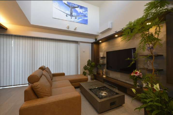 マンションでは珍しい吹き抜けのあるリビングを最上階ならではの特権として活かし、開放的な空間を演出。ダーク系の木製家具でテレビ台と収納を左右対称に配置し、壁面にはタイルを施してテレビを壁掛けにすることで、すっきりとした印象に仕上げました。さらに、シーンに応じて光をコントロールできるよう、調光機能付きの間接照明を採用し、快適で洗練された空間を実現しました。