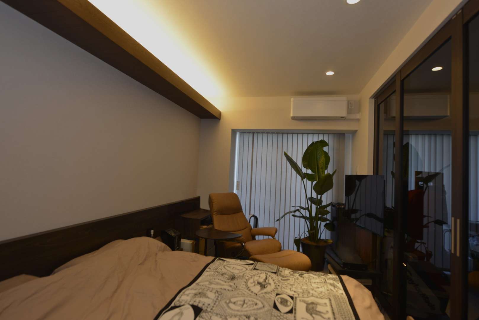 寝室は一日の疲れを癒し、リラックスできる空間となるよう工夫しました。枕元からの眺めには板張りの天井を造作し、柔らかな光が広がる調光機能付きの間接照明を配置。ヘッドボードやカウンターにはダーク系の木製家具を採用し、ベッドの両サイドにナイトテーブルを設置することで、ホテルライクな上質な空間を演出しました。